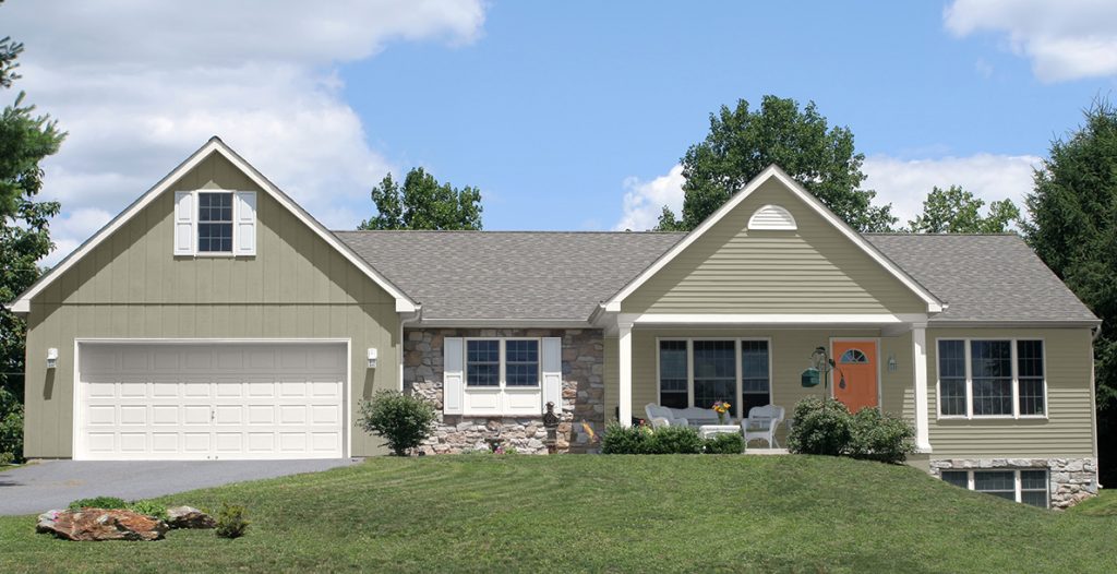 A light gray-green color can be an excellent choice for the exterior of a split-level ranch house with a combination of siding and stone building materials. Jungle Camouflage can unify different building materials, such as siding and stone rather than compete for attention.