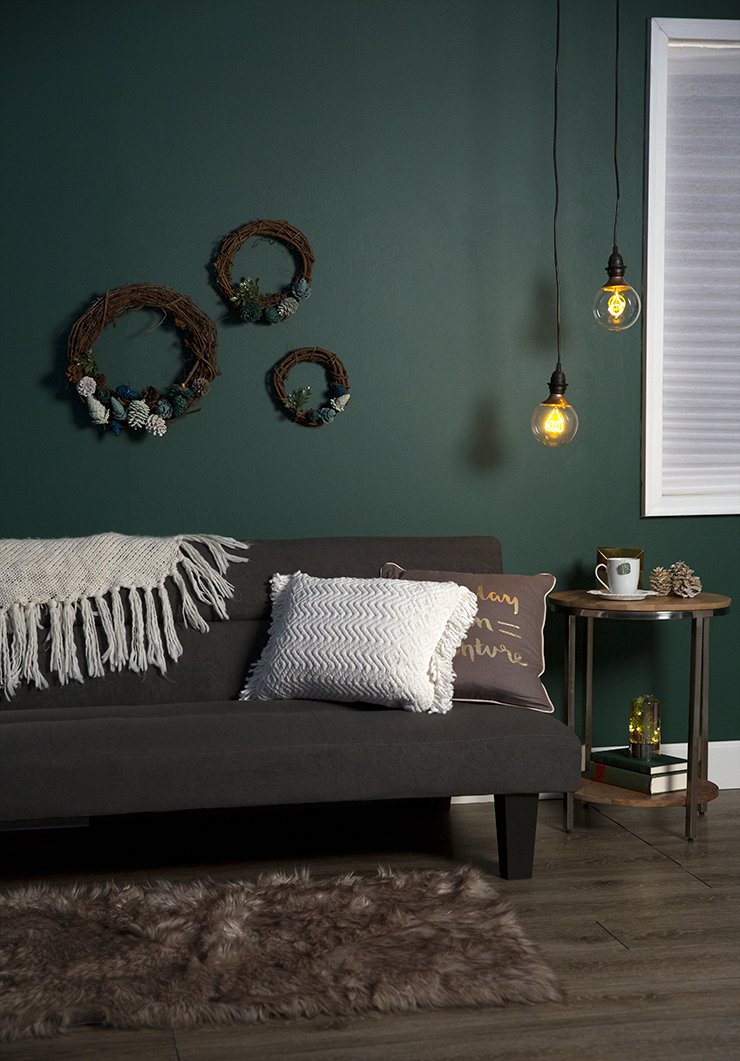 The continuous projects that can be done with gathering pinecones! Be merry and monochromatic with a trio of pinecone wreaths! It will create a subtle holiday look to a bold accent wall and cozy setting.