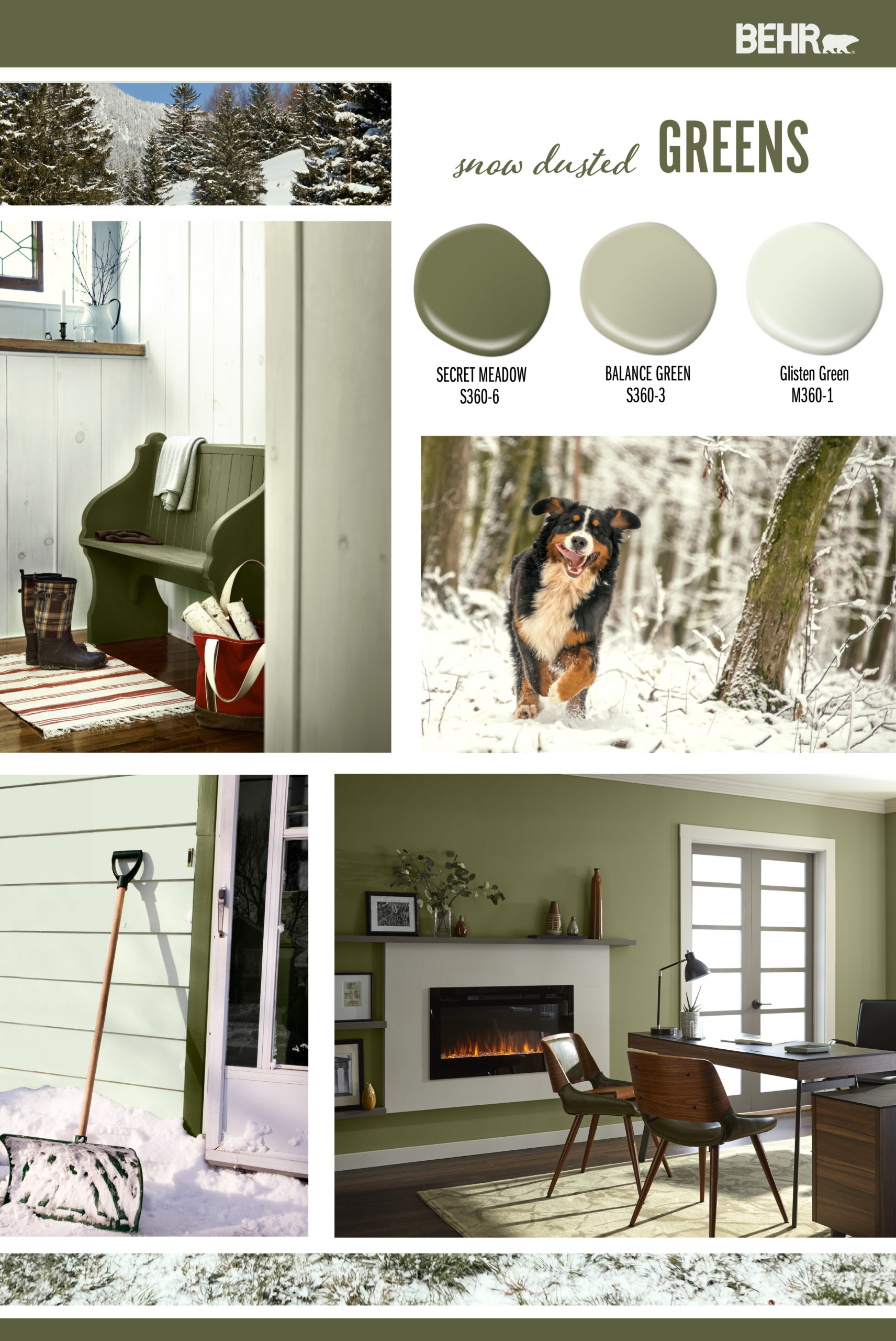 Surround yourself with greens hues this winter. Snow dusted greens like Secret Meadow S360-6, Balance Green S360-3 and Glisten Green M360-1 provide warmth, calming and balance for our minds.