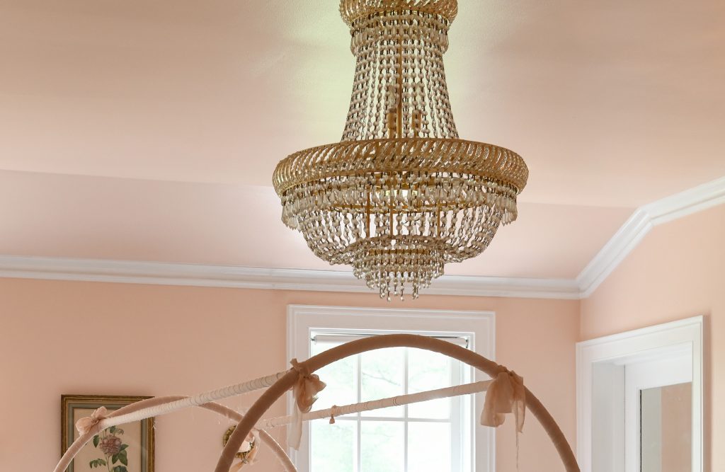 Rather than a typical Flat Sheen that is commonly used for ceilings, Leanne chose to use a Satin Sheen. The shine from the sheen picks up the reflection of the light from the crystal chandelier creating a dramatic look.