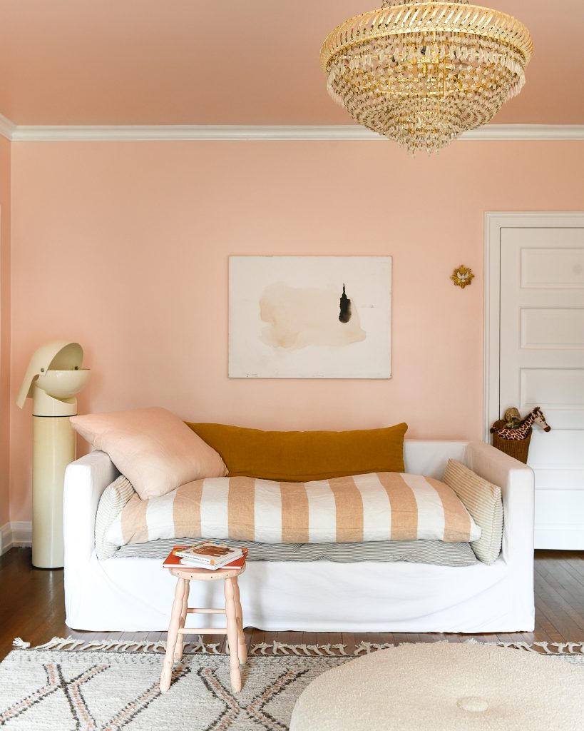 On the bedroom walls, Leanne chose a delicate and enchanting hushed-tone pink; Peach Sachet. A slightly different and soothing pink hue was used on the ceiling; Pink Sea Salt. The combination of the two colors is bright, happy, and young.