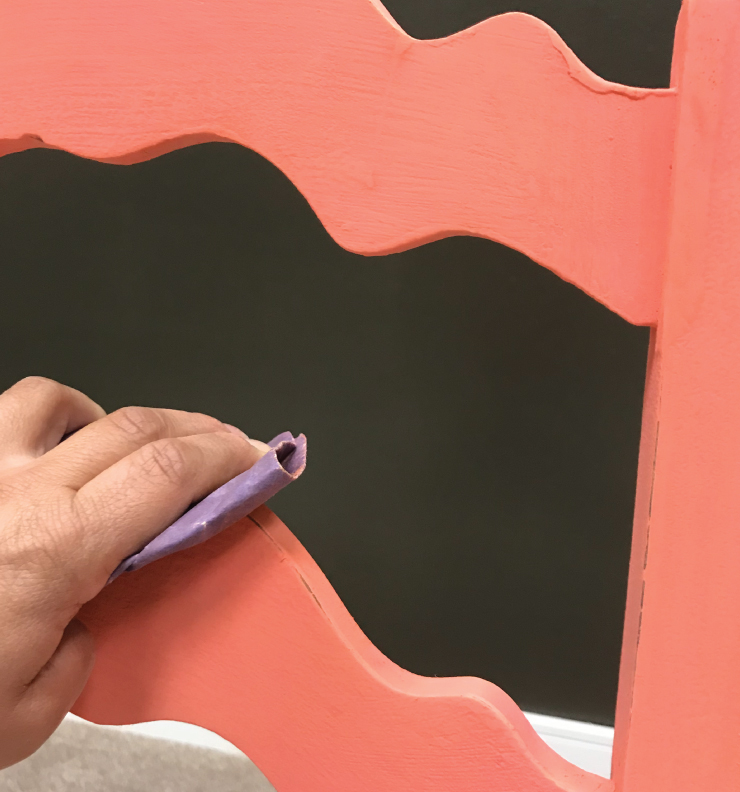 A bit of light prep is a good place to start. Clean your piece free of any food, dust, and previous finish residuals with a gentle cleaning solution. When dry lightly sand your piece to create a surface the chalk decorative paint can adhere to. If there is fabric, or any elements that need to be removed, glued, secured or adjusted do so at this point.