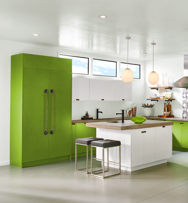 Add a jolt of energy to your kitchen with Fresh Apple on the cabinets. This fresh-off-the-tree tone adds excitement and anticipation to a modern white kitchen. Fresh Apple also looks great alongside slate and steel kitchen accents.