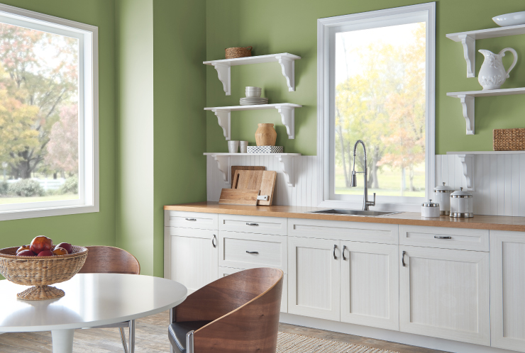Nurturing adds a refreshing look to kitchen walls, whether the room’s style is country cottage, casual modern or somewhere in between. White cabinets look crisp and clean against the green backdrop, accented by white shelves and white or natural wood furniture. Add a colorful tile backsplash or opt for beadboard; then throw in a few kitchen accouterments in white, tan or copper for a cohesive connection.