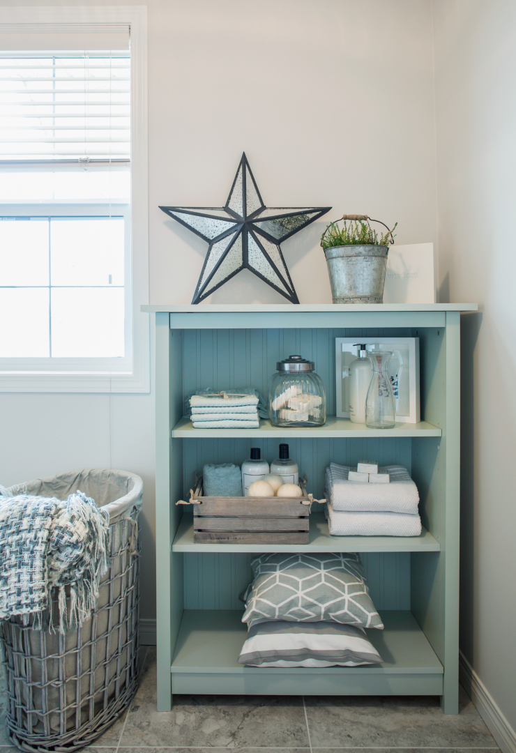 Peek a Blue works wonders on bathroom walls, whether the room’s style is spa-inspired or more of a beach house chic. Outfit the room with white or light wood hues such as driftwood to keep the space feeling fresh, peaceful and light. Peek a Blue also goes well with dark oil-rubbed bronze or black fixtures. In addition, it can be a pleasing color for guest-bath furnishings such as a bookcase used to store spare towels and toiletries.