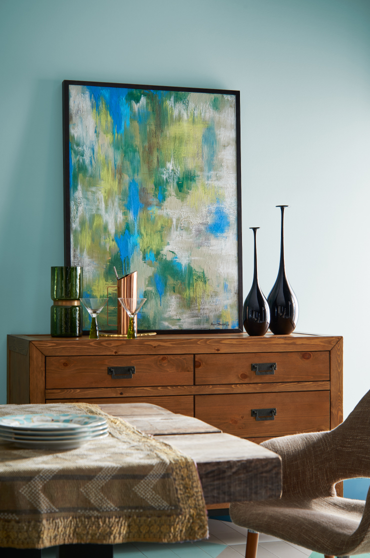 Give a dining room a fresh new outlook by coating the walls in Peek a Blue. Like a pale blue sky, this color serves as an excellent backdrop to highlight the beauty emanating from other colors in the room. A gold chandelier really stands out in the space, coupled with golden table accents and fabrics. Peek a Blue is also the perfect pairing for a painted floor inspired by blue, green and white mid-century linoleum tile. Retro never looked so modern and fresh.