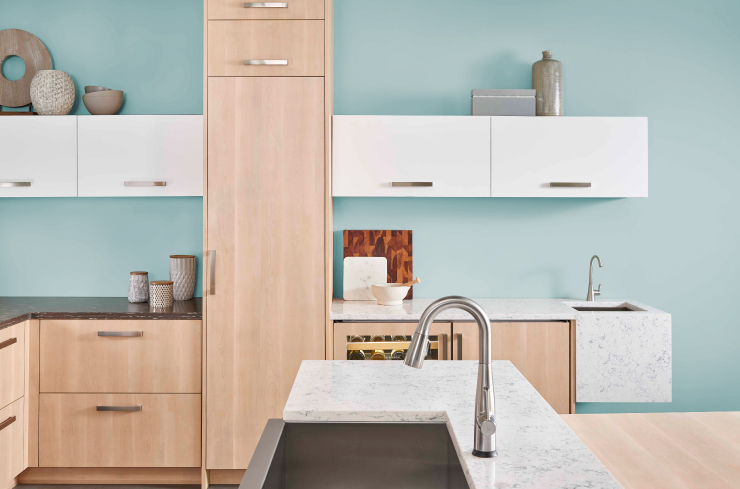 Peek a Blue on the kitchen walls makes the room feel spacious, airy and inviting at the same time. This humble hue works really well with cabinets in white or light wood tones such as oak. It’s also right at home with brushed stainless cabinet hardware and dark granite countertops.