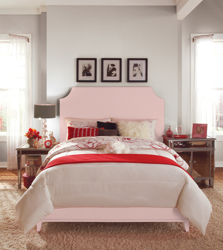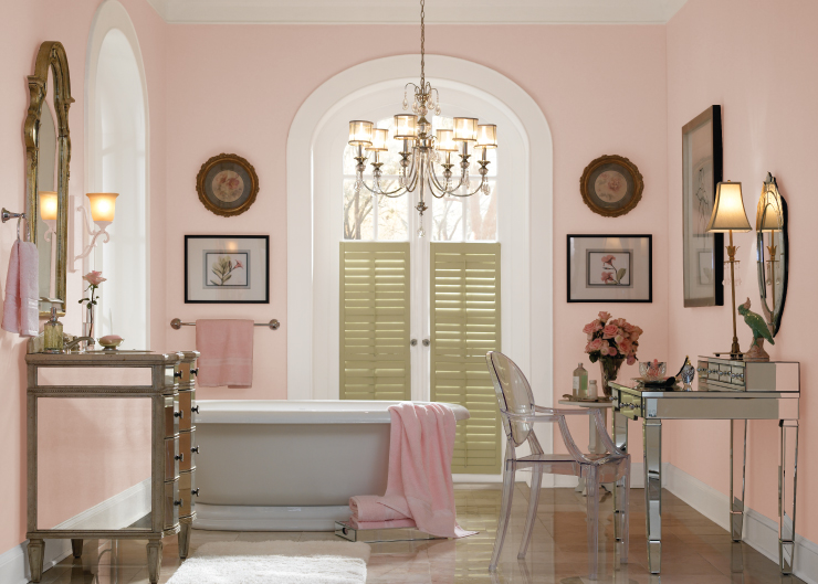 Bathrooms are perfect for this shade of pink, especially those with white or cream hard surfaces. Use it for the towels, window treatments and rugs, but mix these up with autumn russet, toasted walnut, thyme green or igloo blue so the room doesn’t stray into cuteness.