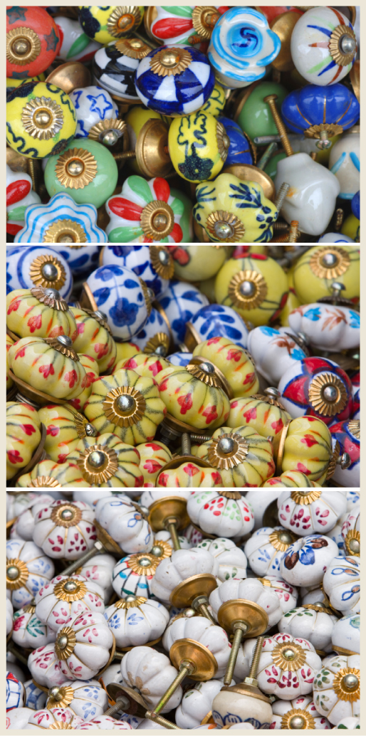 Considered the “jewelry” of the home, small accessories like knobs, handles and pulls add instant character to any piece of furniture. Bright colors in small places brighten not only furniture but an entire room.