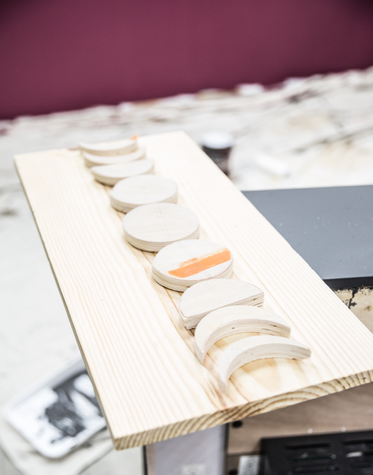 Cut your moon shapes out of your board using a 4″ hole saw and drill press. Follow the guide below for the number of moon pieces, shapes, and colors.