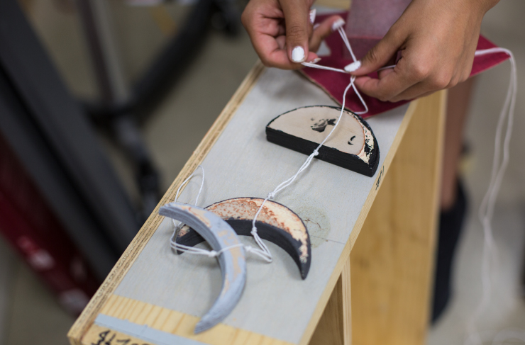 Once the pieces are dry, it’s time to put your moons on your cord. Start by finding the middle of your cord. Double the cord and tie a loop knot at the top. Tie a second knot 3 inches down from your first knot. String your first moon through with one cord, and let the other cord hang down the back. Slide your moon up flush with the knot, bring the two cords together at the bottom of the moon, and tie another knot. Repeat this process for the remainder of your moon pieces. After the last moon, tie a double knot and cut off any extra string.