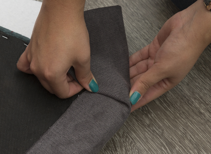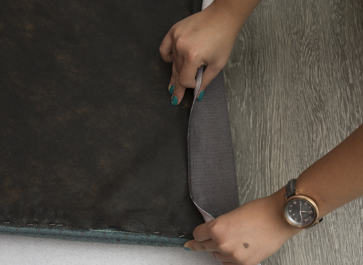 Dart the corners and secure to the cushion with an additional application of glue. Reattached cushions to the furniture piece when done.