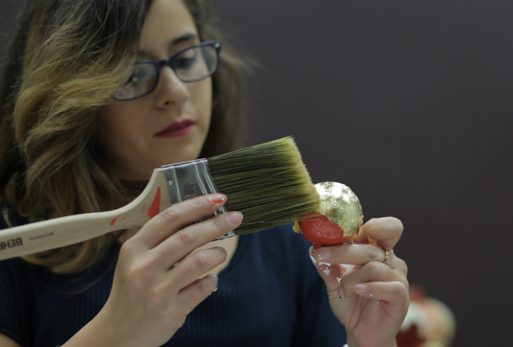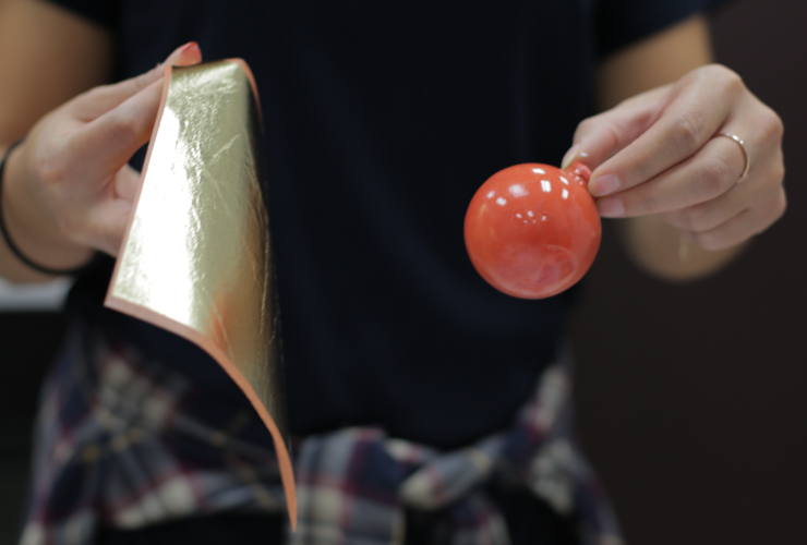 Spray the bottom of the ornaments lightly with spray adhesive. Allow the glue to dry until tacky before adding the gold leaf.