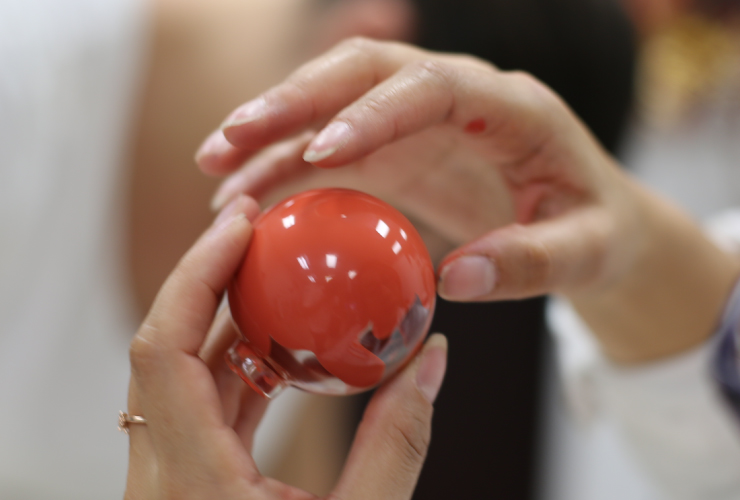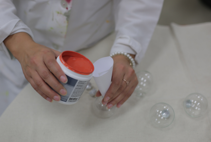 When the inside of the ornament has been completely covered, empty the excess paint back into the sample pot.