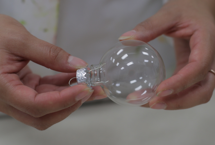 Cut a scrap piece of paper or magazine into a square. Hold one corner and wrap around your finger to create a cone-shaped funnel. Insert the funnel into the open end of ornament.
