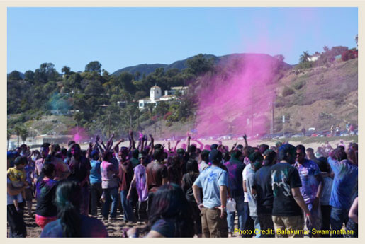 Holi festival goers throw a pink cloud of dust onto the crowd