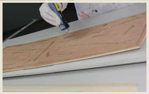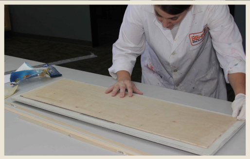 Now would be a good time to put on some rubber gloves. Stronger glues can be difficult to remove without solvents. Apply glue evenly so the corners, sides and middle of the wood panel will stick to the cabinet surface.