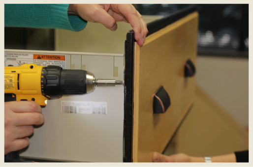 With the help of a friend screw the cabinet fronts back on the cabinet body.