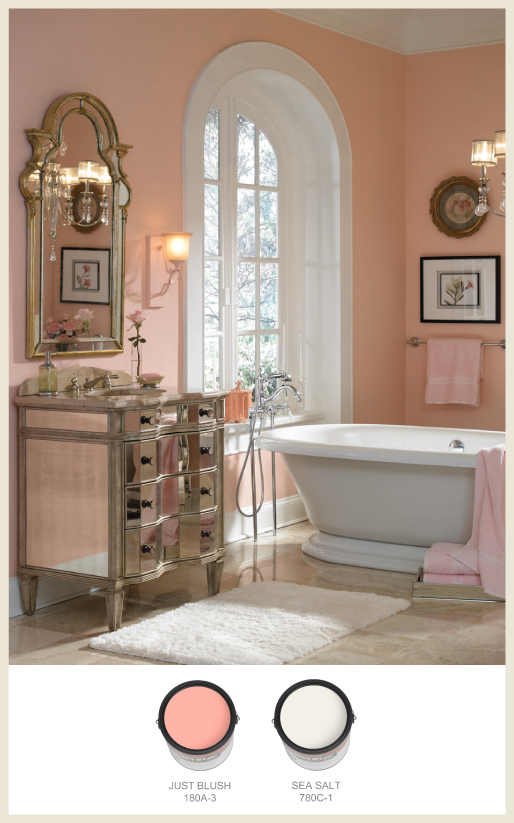 Peach warms a bathroom or dressing area. Gold and reflective surfaces add a touch of elegance.