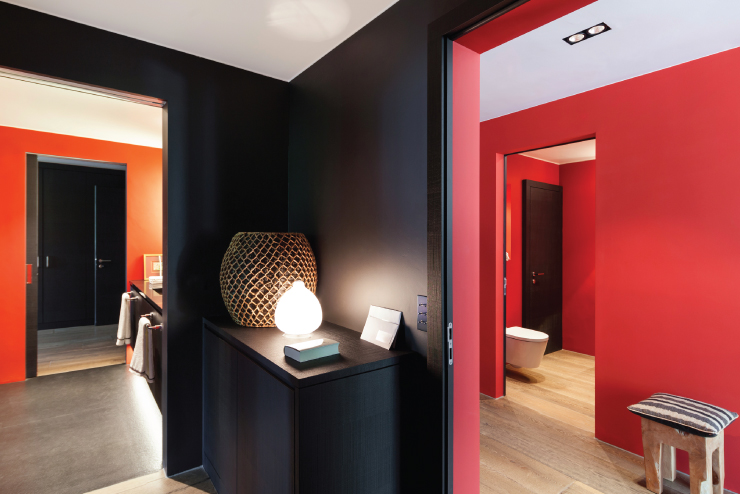 Notice how the mix of colours in this space brings in bold character, personality, and drama. The red and orange almost read as the same colour, both saturated and pure, while the black punctuates the space, set against the lighter hued flooring throughout.