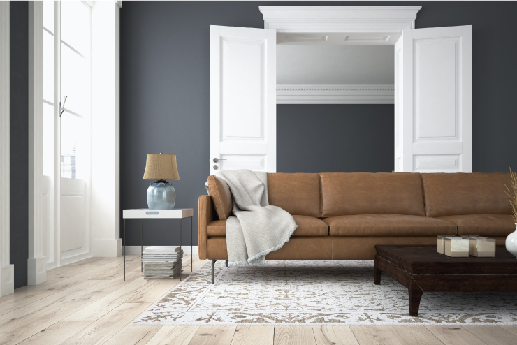 A more neutral palette is represented in this living room, which is somewhat of a study in contrast. The mercury grey on the walls is offset by the white trim and the light-toned flooring. Because this room is large in scale, it can readily take the deeper hue adorning the walls, all the while communicating a refined, understated style.