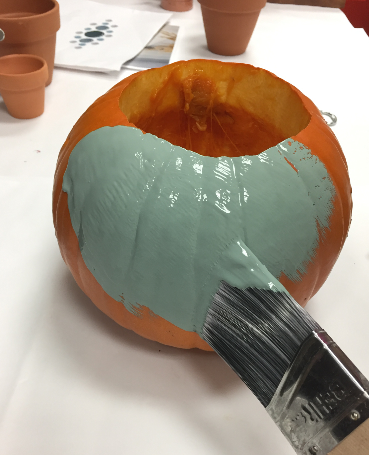 Paint your pumpkins to add color variety to your fall decor. We chose to paint ours, In the Moment T18-15, our 2018 Color of the Year. Completely coat the outside of the pumpkin and allow it to dry before moving on to the next step.