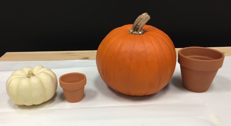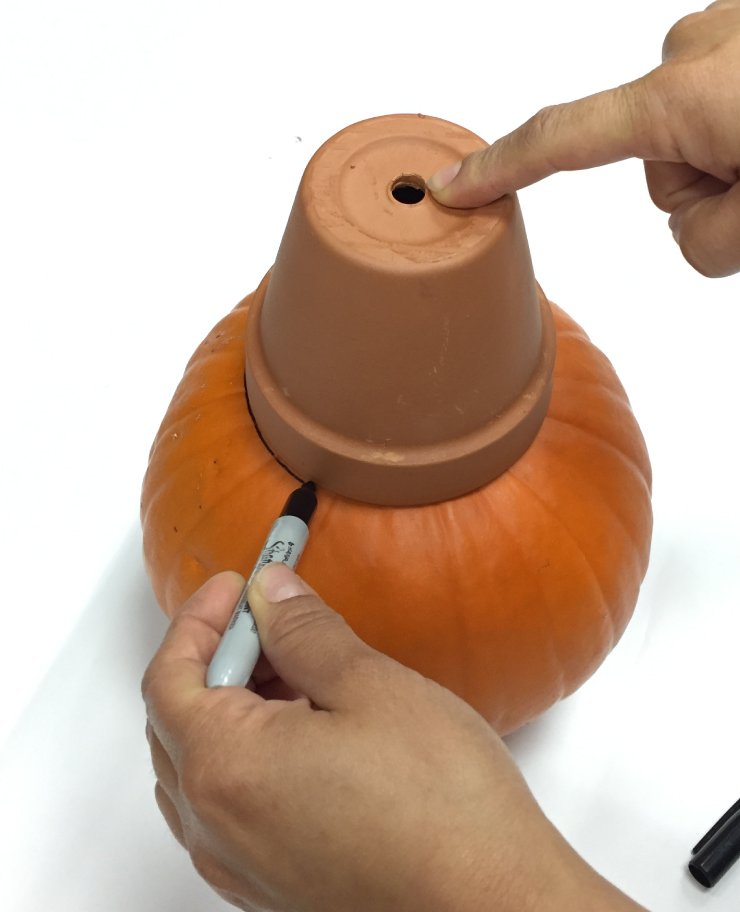 You will need to cut a hole into your pumpkin large enough to fit the pot in. Place the widest part of the pot, on top of your pumpkin and trace a line around it.