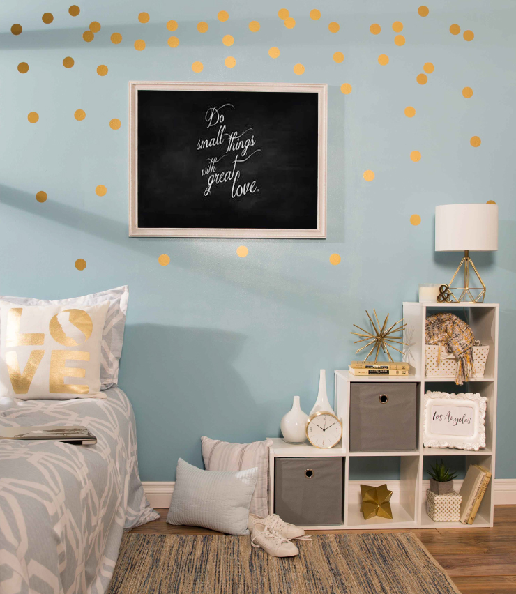 Neutral tones, such as white and gray, add a natural balance and help to ground the room. Painting or creating designs along the top of the walls can help direct attention upwards, helping to establish an open, expansive feel. In to keep the space feeling welcoming, playful and lively, pair Casual Day with pops of bright yellow, or gold decor.