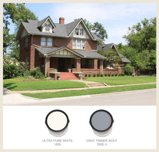 This brick home is a fusion of styles: the upper dormers have Tudor decorative treatment, while the deep porch on the main level is a bungalow attribute. The trim is painted gray to coordinate with the gray roof.