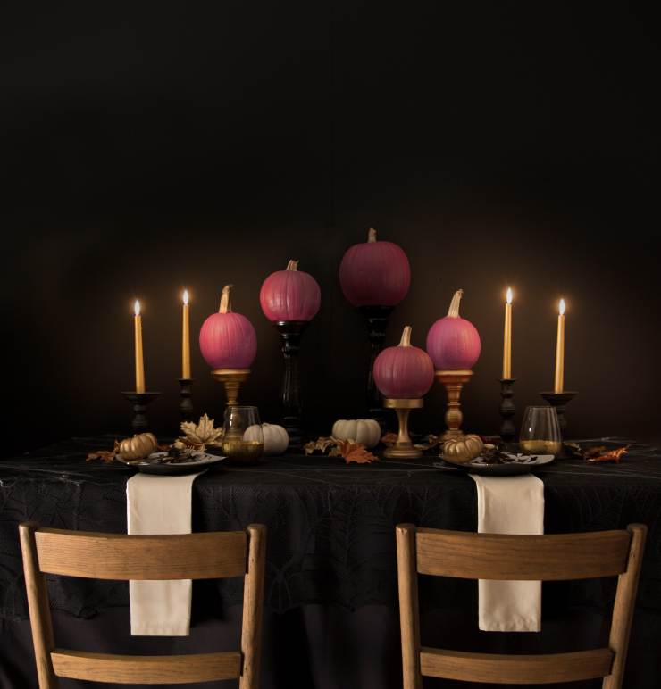 For the haunting display, on the table use a plain black table cloth and cover with a spider web lace. Add some cobwebs and skulls to give an extra eerie feel. Place larger painted pumpkins on stands or candlesticks. The smaller pumpkins can be placed on the table, gathered in one place, and arranged as a focal piece. When you are ready to eat, black & white plates with gold utensils pair well for this setting. Scatter fall leaves and light some candles for that enchanted touch.