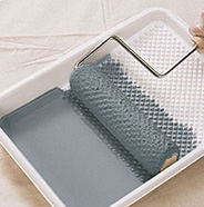 From the bucket, pour paint into a tray and work your roller into the tray until it is fully loaded with paint. For best results, use a 3/8" - 1/2" roller cover.