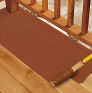 Apply painters’ tape to any deck surface you do not want coated in the DeckOver product. Then, using a 2”-2 ½” wide brush cut in a 2”-3”wide area around the deck floor where the roller cannot reach.  Start at a corner and follow the grain of the wood.