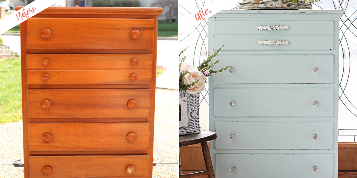 I am updating an old dresser I acquired from my Hubby's grandmother by using paint. It was very dated, but it was a nice petite size and I knew the magic of paint would bring it back to life.