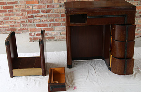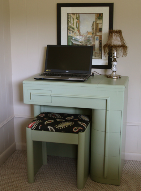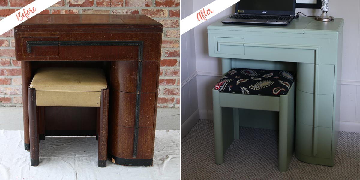 I flipped a flea market find into a work/study desk. I painted a vintage sewing machine cabinet, drilled a hole for electrical cords in the desk top, and re-covered the cushioned seat. The desk is a fun, functional addition to our den.
