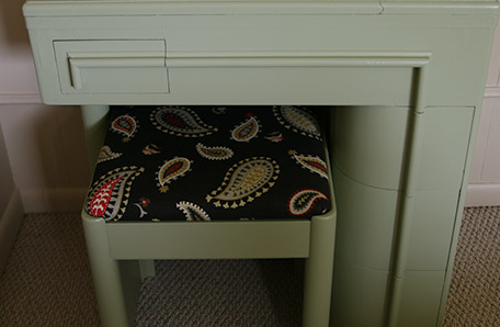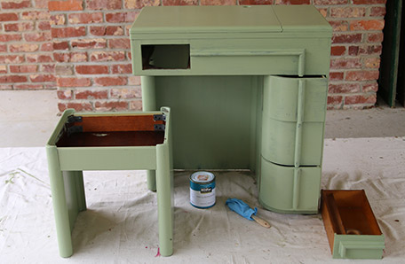Time to paint! The paint brushed on like butter and the color was perfect. I painted the stool first then the one drawer I could remove from the desk. Next I painted the underside of the desk, the front, the sides, the back, and the top in that order. I painted with the grain of the wood. I finished applying the first coat of paint in about an hour. I let the first coat of paint dry for two hours and brushed on a second coat. While the second coat of paint was drying, I re-covered the stool cushion.