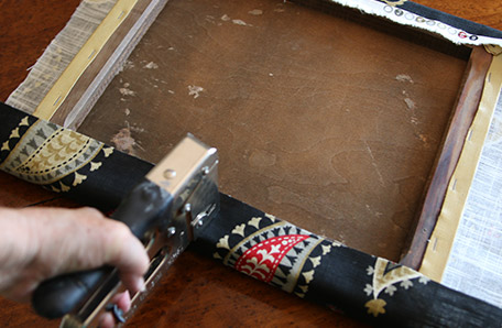 I cut the fabric and stapled one side of the fabric to the cushion bottom. Next I pulled the opposing side till it was taut and started stapling from the middle to the outside.