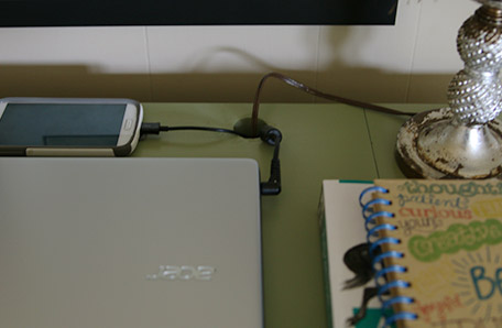 After the piece was prepped, I decided to have my husband drill holes for all of the cords. This is a great way to manage the computer cord, lamp cord, phone charging cord, and any other cords. We used a drill and key hole bit to drill one hole in the top of the back side and also one hole on the cabinet top for the cords. That way we could thread all the cords through the back and up to the top of the desk. Cool!