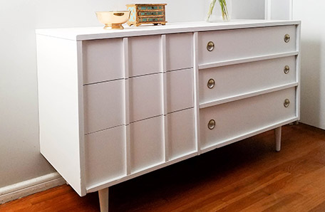 My typical tools include a paint brush and paint, but for these Mid-Century pieces I also like to use a micro-foam roller and pan. It makes the job faster and gives a super-smooth finish.