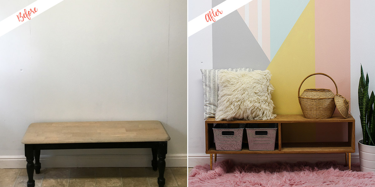 The side entry of our home was drab and had no character. I wanted to add a pop of color to the space without painting the entire wall a bold or bright color. I came up with this simple geometric wall art. You will be surprised at how easy this is to recreate!