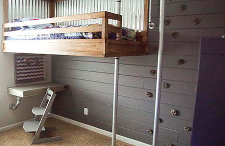 After the base of our son’s new loft bed was built, we began installing the shiplap style wall. Every hardware store has different options for wood wall siding and any type will work. The type of joint used to secure the boards together determines the name for the wood siding. (i.e. shiplap joints are different then car siding joints) At our local store we can usually find a good selection of car siding, also called tongue and groove board, so we bought enough to cover the entire wall. We removed the molding along the bottom of the wall. Then we used our nail gun to attach the car siding to the walls. We added long screws to attach the boards into studs in order to support a rock climbing wall. We staggered the vertical joints of the boards as they were hung beginning at the ceiling and working our way down the wall to the floor. We used a compound miter saw to cut the boards to the needed lengths. Then we trimmed and reattached the molding over the car siding.