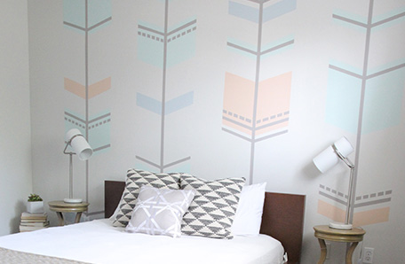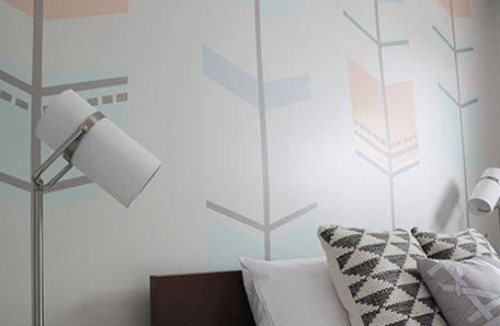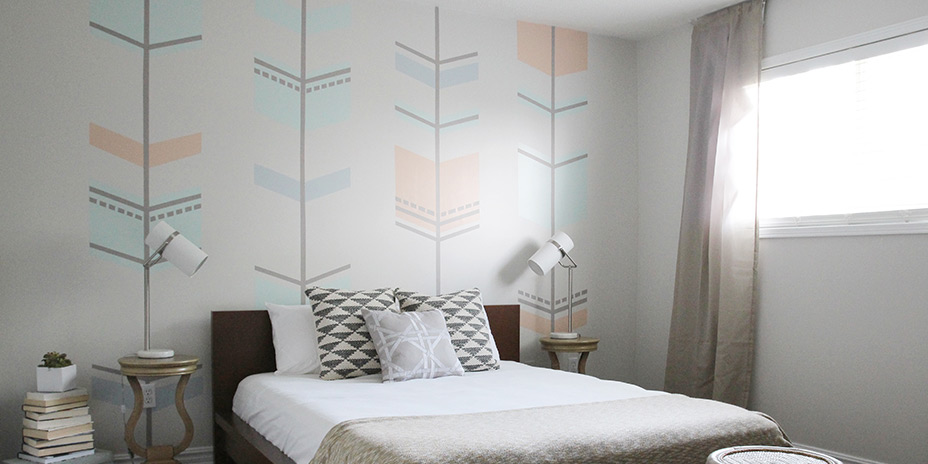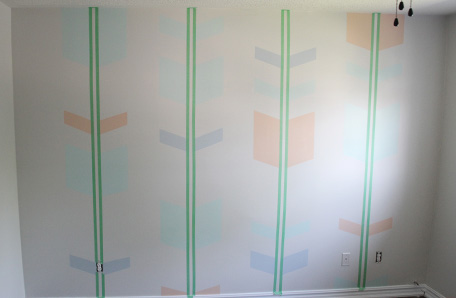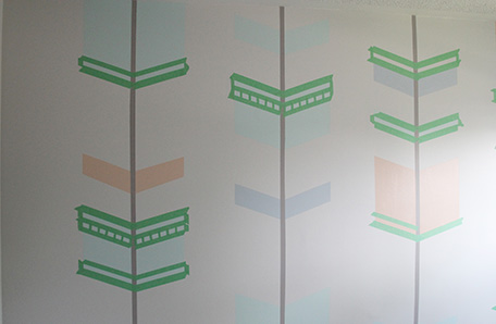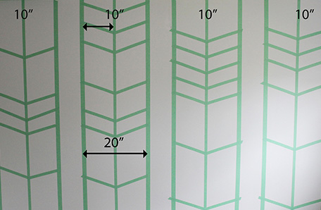 To create the tribal arrow graphic, I went into great detail. However, you can adjust according to your own preference or skill level. To start, I created four 20” wide stripes on the wall. Next, you need to find the center point of each stripe. Place another diagonal stripe at 10”.
