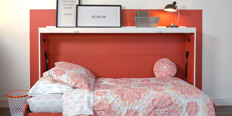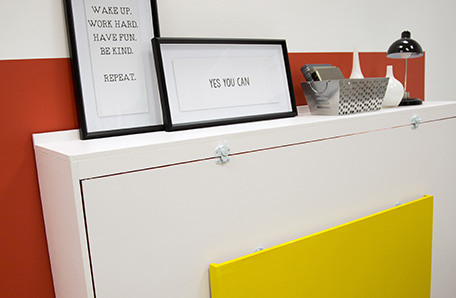 Inspired by a Poppi Desk, we loved the idea of a fold-up bed that also included a fold-down desk. We followed the build instructions found here; and along with some strategic color placement, we successfully created a space that is both dynamic and practical.