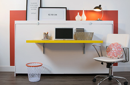 When dealing with limited space, a hideaway bed can be a great option – with a limited foot print, the bed can literally be tucked away. For added functionality, we loved the idea of adding a desk attachment that similarly could be showcased or stored depending on the situation.