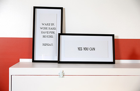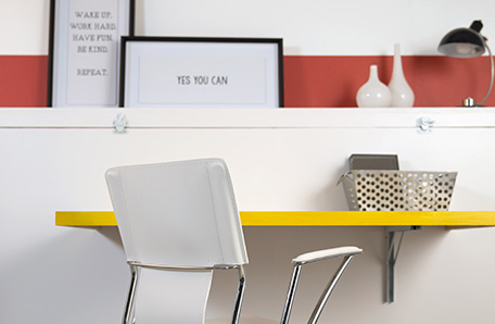 After assembling the desk, we chose palette colors to paint different pieces. Polar Bear was used for the exterior bed frame. Two of our 2017 Color Currents colors, Hot and Spicy -- a vivid, rust red, and Lemon Burst -- a sunny yellow, accented the bed and desk respectively.