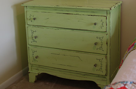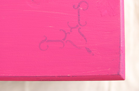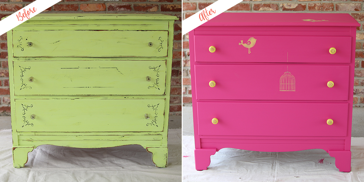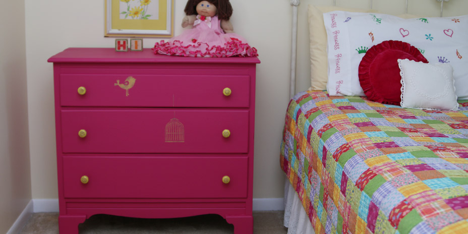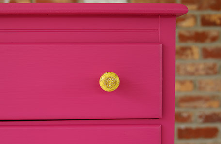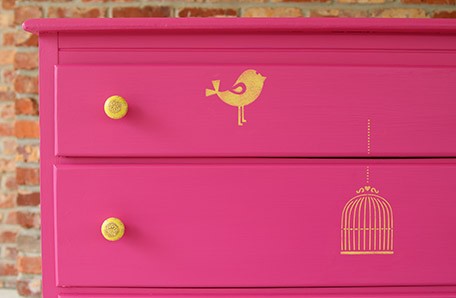 This is a wow project for my granddaughters’ bedroom. The dresser in their bedroom was a soft green with glass knobs. The paint finish was pretty but it didn’t wow me. I chose a new color scheme for the dresser and went to work. I painted it Diva Glam, a bold fuchsia, and added yellow accents using stencils.