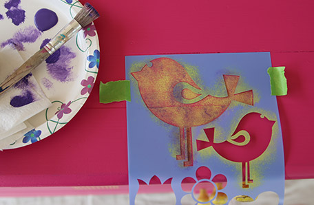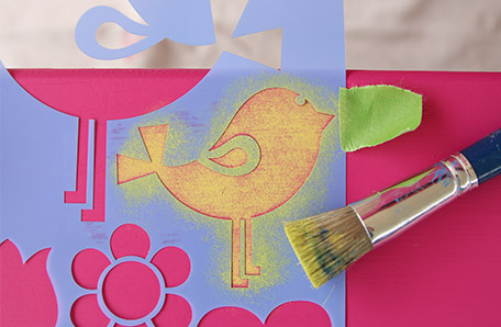 I had a cute stencil with bird designs and another stencil with a small hanging bird cage. I placed the stencils where I wanted the design to display and taped them in place with painter's tape.