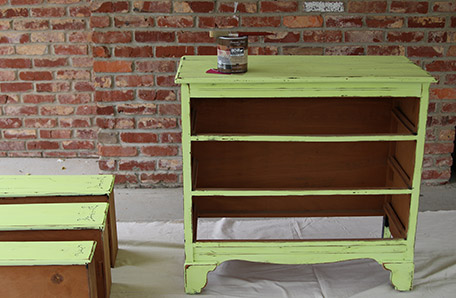 This time I decided to paint over the existing paint without sanding or priming the finish. I grabbed my 2-inch paint brush, opened the can of Diva Glam, and started to work. I painted the sides first, then the front, the top, and the drawers last.