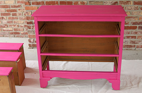I applied a second coat of paint with a heavier coat on the drawer fronts to cover the black designs from the previous paint job. The black showed through the paint because of the stark contrast between it and the green paint finish. If the dresser had been solid black the pink paint would cover it just fine.