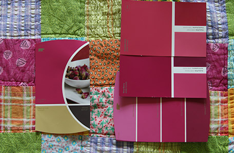 I was debating between a shade of purple or a bold pink. I would also need to pick an accent color for the stencil design. After looking at the color guides and the huge display of paint chips, I decided to go with pink paint (Diva Glam) for the dresser and yellow (Buzz-in) for the stenciled design.