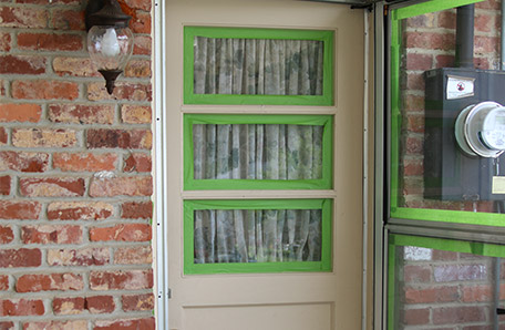 To prep for painting, I cleaned both doors with an all-purpose cleaner and removed a little oily residue with a mixture of baking soda and water. My husband goes crazy oiling hinges. I think it’s a man thing. Next, I used painter’s tape and taped around the glass, brick, and anything else I didn’t want painted.